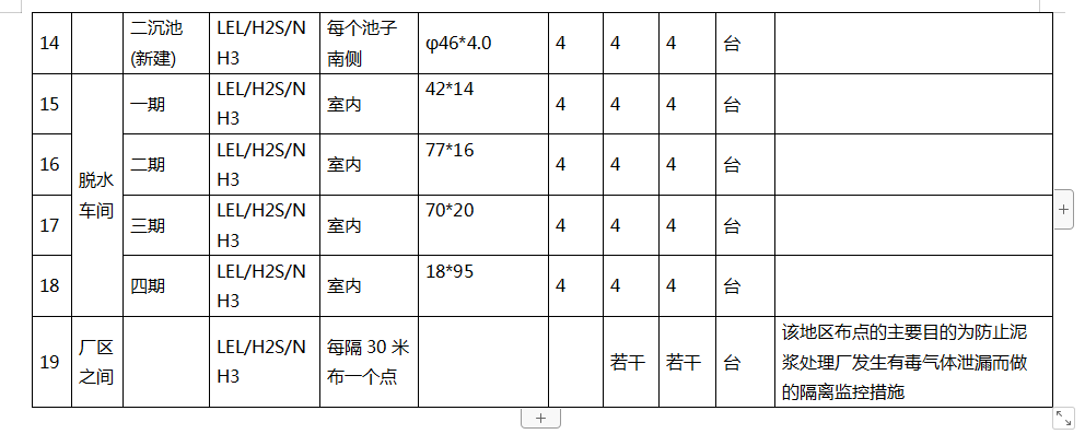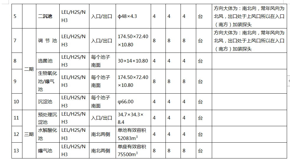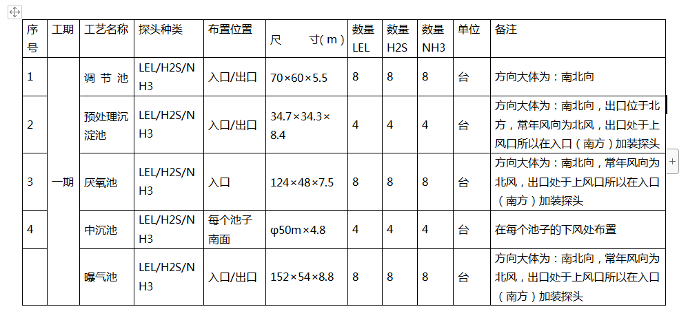 1.1.2 根據(jù)污水處理廠的常用監(jiān)控氣體種類為:可燃氣、H2S和NH3,建議設置VOC檢測器,以檢測有機揮發(fā)物。因此在每個監(jiān)控點上均布置相同的可燃氣、H2S和NH3 探頭。