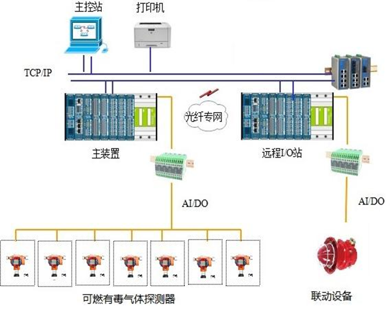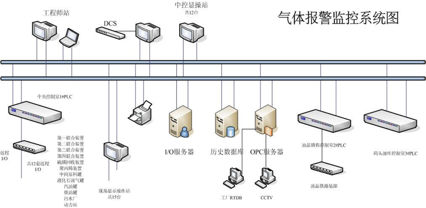 系統(tǒng)由安裝在現(xiàn)場的可燃/有毒氣體探測器和安裝在控制室內(nèi)的控制單元、數(shù)據(jù)采集模塊、工作站等組成。通過數(shù)據(jù)采集模塊對現(xiàn)場檢測器實施數(shù)據(jù)采集,并通過通訊模件完成于操作員站或第三方系統(tǒng)(設(shè)備)之間的通訊,接受相關(guān)信息并傳遞實時數(shù)據(jù)。