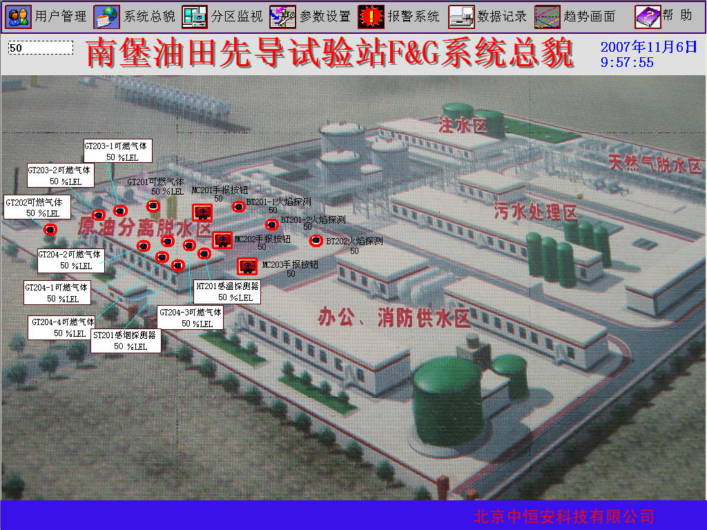 顯示及報警畫面將總貌畫面、分區(qū)畫面及單個探測器信息畫面??偯伯嬅鎸ǜ鱾€裝置和公用工程部分等,分區(qū)畫面為裝置內(nèi)的探測器位號及布置位置、報警信息等。用鼠標(biāo)點擊某一分區(qū)就可把界面轉(zhuǎn)入分區(qū)顯示狀態(tài)?,F(xiàn)場任一探測器故障報警時,總貌畫面內(nèi)對將的裝置將閃爍或自動彈出分區(qū)畫面。