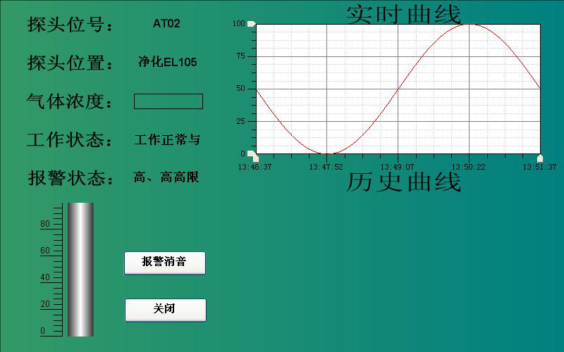 操作人員可以通過工控機的觸摸屏、操作員站和工程師站等人機交互界面,實時監(jiān)視廠區(qū)內(nèi)所有檢測點的情況,主要有氣體濃度值,報警上限,實時曲線和歷史數(shù)據(jù)等。當(dāng)發(fā)生報警時也可以通過工控機進行消音和報警響應(yīng)。