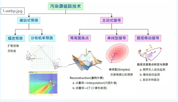 VOCs臭氣污染溯源技術(shù)是污染物濃度監(jiān)測(cè)結(jié)果的綜合應(yīng)用,其原理是利用點(diǎn)監(jiān)測(cè)或線監(jiān)測(cè)設(shè)備的監(jiān)測(cè)結(jié)果,結(jié)合風(fēng)向數(shù)據(jù),計(jì)算污染物在空間中的機(jī)率分布,或利用適當(dāng)?shù)穆肪€規(guī)劃,移動(dòng)量測(cè)位置以達(dá)到標(biāo)定污染源位置的目的。綜合國(guó)內(nèi)外的技術(shù)發(fā)展現(xiàn)狀,污染溯源技術(shù)可大概分為被動(dòng)式及主動(dòng)式兩種(如下圖)。主動(dòng)式搜尋方法較常見(jiàn)的有等高圖高點(diǎn)、單純型搜尋和路徑移動(dòng)搜尋。被動(dòng)式預(yù)測(cè)方法則包含煙流預(yù)測(cè)和分布幾率預(yù)測(cè)等方法。
