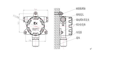 安裝方法:在墻上畫好安裝孔,使用8mm×100mm膨脹螺栓,在墻面固定好的膨脹螺栓,將變送器安上,再用螺母加彈墊和平墊固定好,見圖5。安裝高度根據(jù)測試的氣體不同而不同,原則上比空氣輕的氣體安裝在泄露源上方,反之 安裝在泄露源下方,具體判斷方法,查看氣體分子量,如果比28小,則比空氣輕,如果比28大,則比空氣重,變送器固定好后將上蓋卸下,從進線口引入兩芯電纜(Ex型為三線制)。按正負極性接入接線端子(Ex型圖示連接)見結(jié)構(gòu)圖,然后鎖緊防水接頭,各環(huán)節(jié)檢查無誤后,將上蓋擰緊。